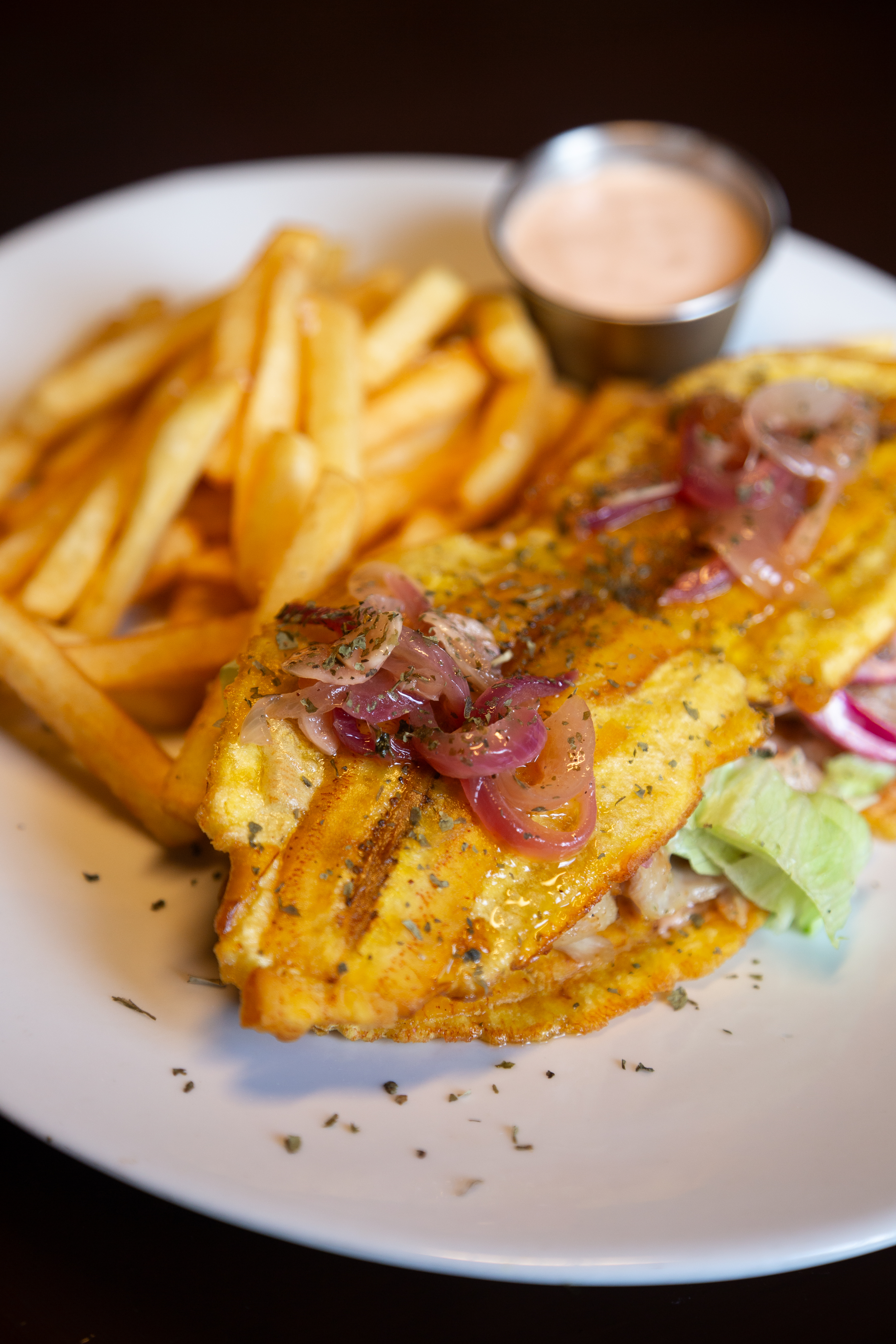 Flattened fried green plantain instead of bread with your choice of chicken ($12) or steak ($15)